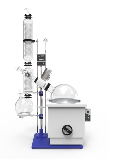 旋轉(zhuǎn)蒸發(fā)器是由水浴加熱系統(tǒng)、溶劑回收系統(tǒng)、真空系統(tǒng)(選配)組成。溶劑回收系統(tǒng)直立于底座之上,并可自由旋轉(zhuǎn),操作者可以方便的安裝或者取下裝置背面的樣品。溶劑瓶置于水浴加熱系統(tǒng)之中,可直接用于回收沸點(diǎn)為65℃的溶劑,配合真空系統(tǒng)后可用于回收沸點(diǎn)高達(dá)90℃的溶劑。